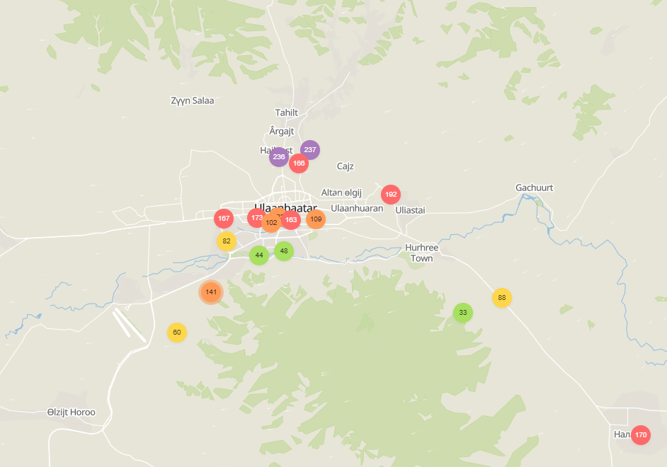 Тус сайтын индексээр Улаанбаатар хотын агаарын чанарын индекс (АЧИ) дунджаар 114 байна. Индекс 101-150 хооронд бол тоос, утаанд мэдрэг бүлгийн хүмүүст эрүүл бус гэсэн үг. “IQAir” нь Улаанбаатар хотод агаарын чанар хэмждэг 16 станцтай. Тэдгээрээс Хайлааст дахь станц нь 222 АЧИ бүртгэж байна. АЧИ 201-300 байвал АЧИ маш эрүүл бус гэж үздэг. PM 2.5 хэмжээтэй тоосонцрын концентраци метр куб агаарт 40.8 микрограмм байгаа нь ДЭМБ-ын зөвлөдөг хэмжээнээс 8.5 дахин их байна.
